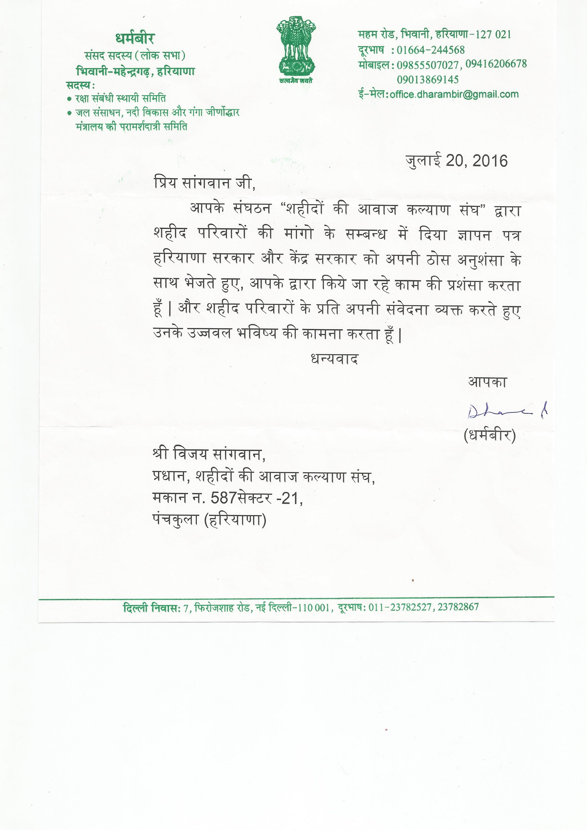 Letter from Ministry of Home Affairs Dated: 30th August, 2016 & 20th June, 2016 regarding request made for providing financial assistance for the families of Martyrs.